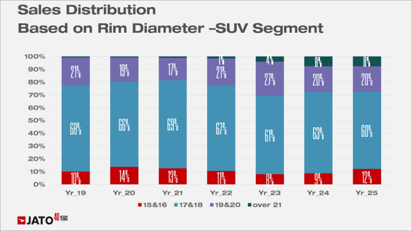 セグメントの拡大に伴い、より多様なSUVラインナップが市場に登場し、ホイールサイズにも顕著なトレンドの変化が見られます。欧州ブランドを中心に、上位グレードに大径リムを標準装備するモデルの展開が進む一方で、小型SUVの販売拡大に伴い、小径リムのシェアも増加しました。このように、近年のホイールサイズの傾向には二極化が確認されています。
