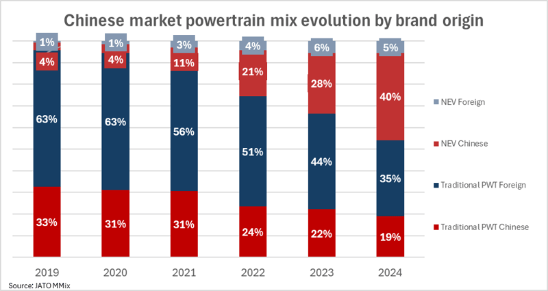 Beyond the shift in brand leadership, a deeper layer of transformation emerges when analyzing the evolution of powertrain technologies in China in relation to the origin of the brands. The Chinese automotive market is now strongly driven by New Energy Vehicles (NEVs)—a category that includes Battery Electric Vehicles (BEVs), Plug-in Hybrid Electric Vehicles (PHEVs), and Extended-Range Electric Vehicles (EREVs). In 2024, NEVs accounted for 45% of total registrations, marking a sharp contrast with more “traditional” internal combustion technologies (ICE, Mild Hybrid—MHEV, and Full Hybrid—HEV).