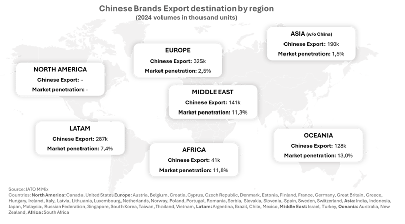 In the United States, Chinese vehicle exports are virtually non-existent, primarily due to high import duties imposed by U.S. administrations.