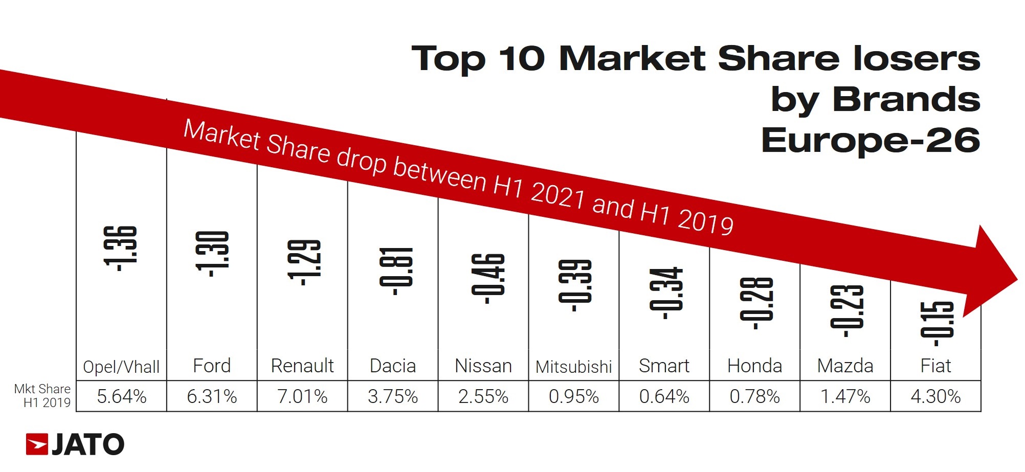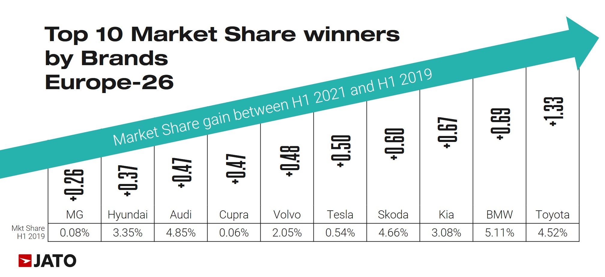 Once again, out of turmoil, Volkswagen Group has emerged successful. The German OEM secured the highest increase in market share between H1 2019 and H1 2021 – with the percentage jumping from 24.3% to 26.2%. However, its volume fell by 17%.