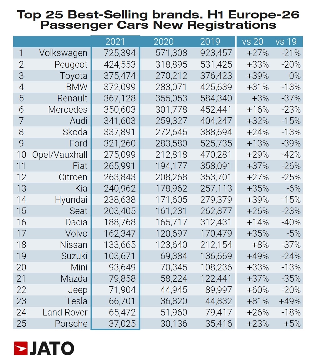 Following June’s registrations results for Europe, JATO Dynamics shares H1 figures for 26 markets.