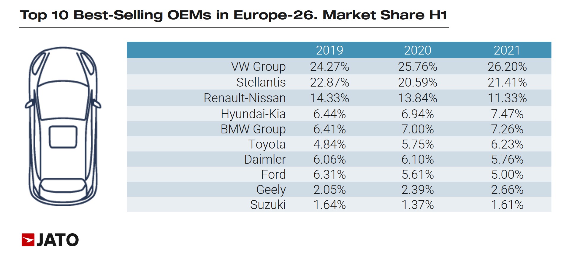 Unsurprisingly, in comparison to the same period in 2020 – when the impact of the pandemic and its various local lockdowns were in full force – the majority of OEMs operating in Europe posted positive volume upticks in H1 2021. However, the real differentiators can be seen when compared to H1 2019, in particular, with Volkswagen Group securing first place for market share this year.